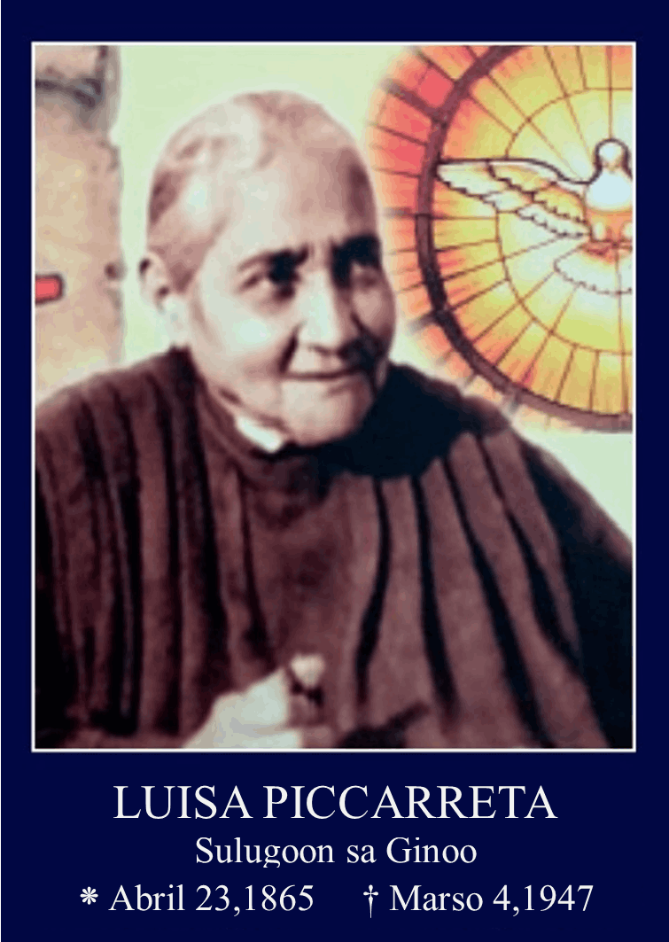 Sa among dakong tinguha nga ipahibalo kini nga Gingharian sa gugma, hustisya, ug kalinaw, mapaubsanon kami nga naghangyo nga Imong himayaon ang Imong Alagad nga si Luisa, ang Mapaubsanong Anak sa Imong Diosnong Kabubut-on, nga uban sa iyang kanunayng pag-ampo ug pag-antos, uban sa dakong tinguha alang sa kaluwasan sa mga kalag ug sa pag-abot sa Imong Gingharian dinhi sa kalibutan.