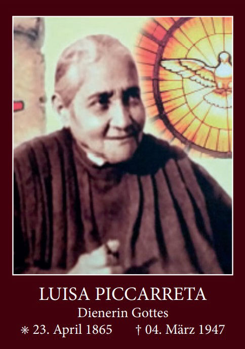 In unserem großen Wunsch, dieses Reich des Lebens, der Gerechtigkeit und des Friedens bekannt zu machen, bitten wir DICH demütig, DEINE Dienerin Luisa, die kleine Tochter des GÖTTLICHEN WILLENS, zu verherrlichen, die sich mit ihrem ständigen Gebet und Leiden zutiefst nach dem Heil der Seelen sehnte und nach dem Kommen des Reiches GOTTES in der Welt.